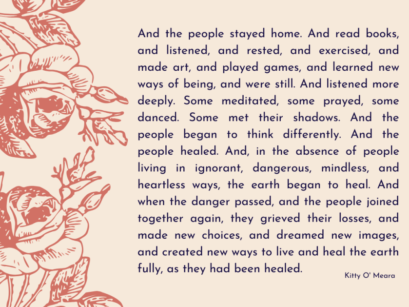 I also saw this thought-provoking poem by Kitty O’Meara (below) which she wrote about the situation we are currently in and which has been widely shared online. This poem comforted me in this first week of not knowing where this is all going.”